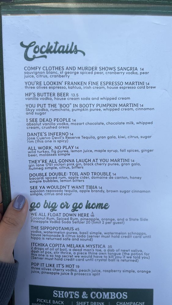 vodka, watermelon puree, basil simple, watermelon schnapps, house lemonade & citrus soda (server must hold credit card until hippo is returned safe and sound)